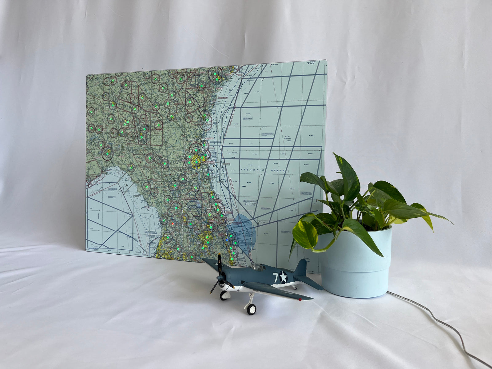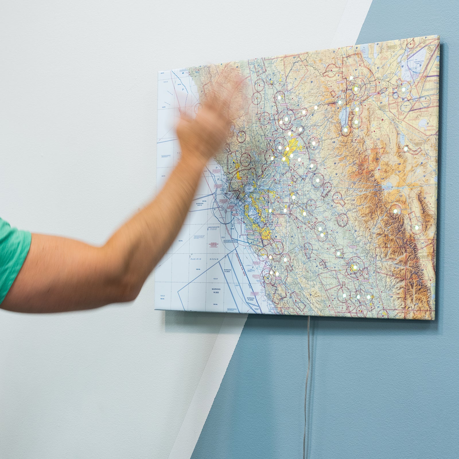 The LightMap AIR™ display is a standard FAA VFR sectional with illuminated METAR weather conditions. Always on and real-time. Each of the hundreds of lights is projected onto the map surface from the back to give an indication of the weather in your area. (Purple is the worst, followed by red, blue, and green.) Simply wave your hand in front of the display to see the weather forecast for the next 24 hours.